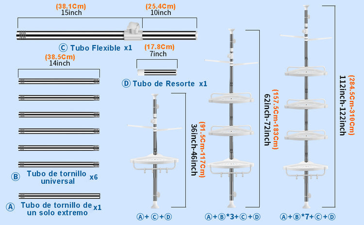Olvídate de taladros o herramientas. Este organizador se instala en segundos gracias a su sistema telescópico de presión, que se ajusta fácilmente entre el suelo y el techo o sobre la bañera. Su altura es regulable de 1 a 3 metros, adaptándose perfectamente a tu espacio.